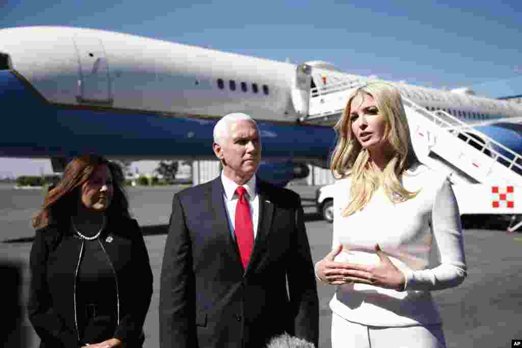 2018年12月1日,在墨西哥城机场停机坪,在美国副总统专机空军二号前面,伊万卡·特朗普对记者发表谈话,美国副总统迈克·彭斯和夫人凯伦在旁边。