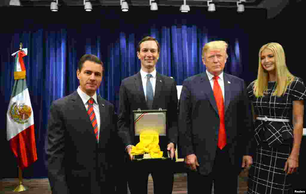(左起)墨西哥总统涅托,贾里德·库什纳,美国总统特朗普和他的女儿伊万卡·特朗普2018年11月30日在阿根廷布宜诺斯艾利斯举行的G20峰会之前,库什纳接受墨西哥总统颁发的阿兹特克之鹰勋章后拍照留念。