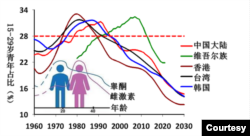 台湾和韩国的青年比例从1966年的25%上升到1980年代初的32%、31%的高峰。居民可支配收入占GDP的65%以上,民间力量活跃。经济高速增长,民主热情高涨,民运、学运此起彼伏,两地在1987年完成政治转型,中位年龄只有25岁、26岁。